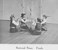 Then repeat, going to left; music gets gradually quicker, and they get faster and faster until on the last bar they all suddenly sit down on the floor with a yell and clap their hands on the last note of music. All the feet should join in the centre.To rise, all lean on right hands and two facing one way, two facing the other, spring up and run off. (See Photograph.)